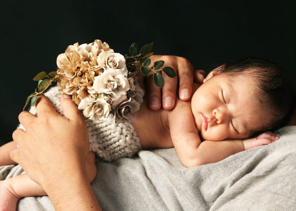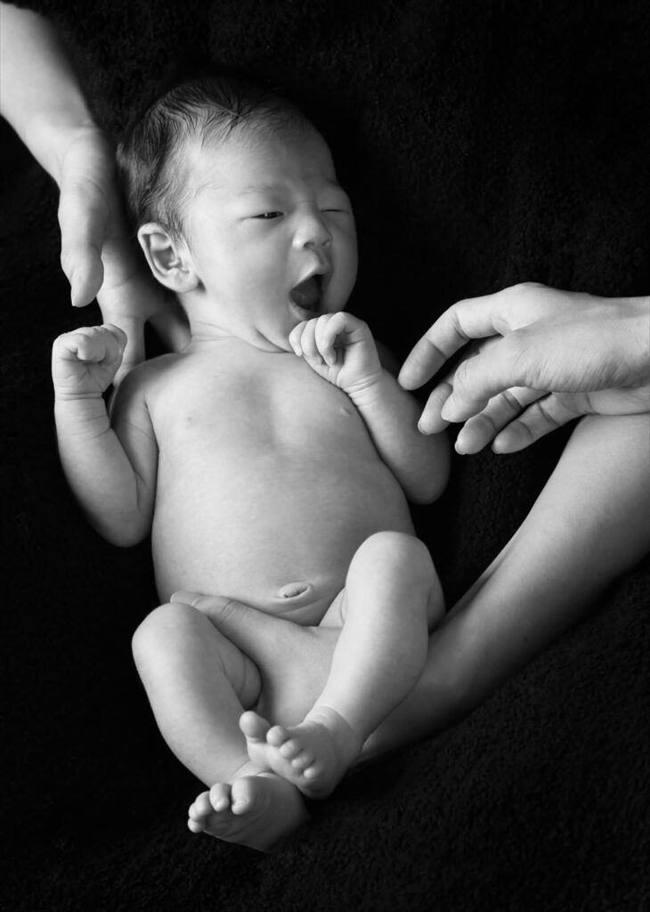 「誕生の喜びを作品に」産まれたばかりの赤ちゃんは、ママのおなかの中にいた時と同じように身体を丸めたポーズが落ち着きます。 すっかり落ち着いて眠りにつく姿はなんとも愛おしい貴重な1枚です。生後3週間以内。わずかな期間でしか撮ることのできない貴重な写真。ぜひこの機会に撮影をご検討くださいませ。